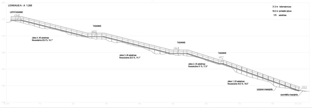 Portaita näyttää tulevan 179 askelmaa, jotka nousevat 21m ylöspäin. Kokonaispituutta rakennelmalle tulee 83,2m. Portaat rakennetaan olemassa olevan polun viereen rinteen puolelle, siten että halutessaan voi edelleen nousta myös polkua pitkin.