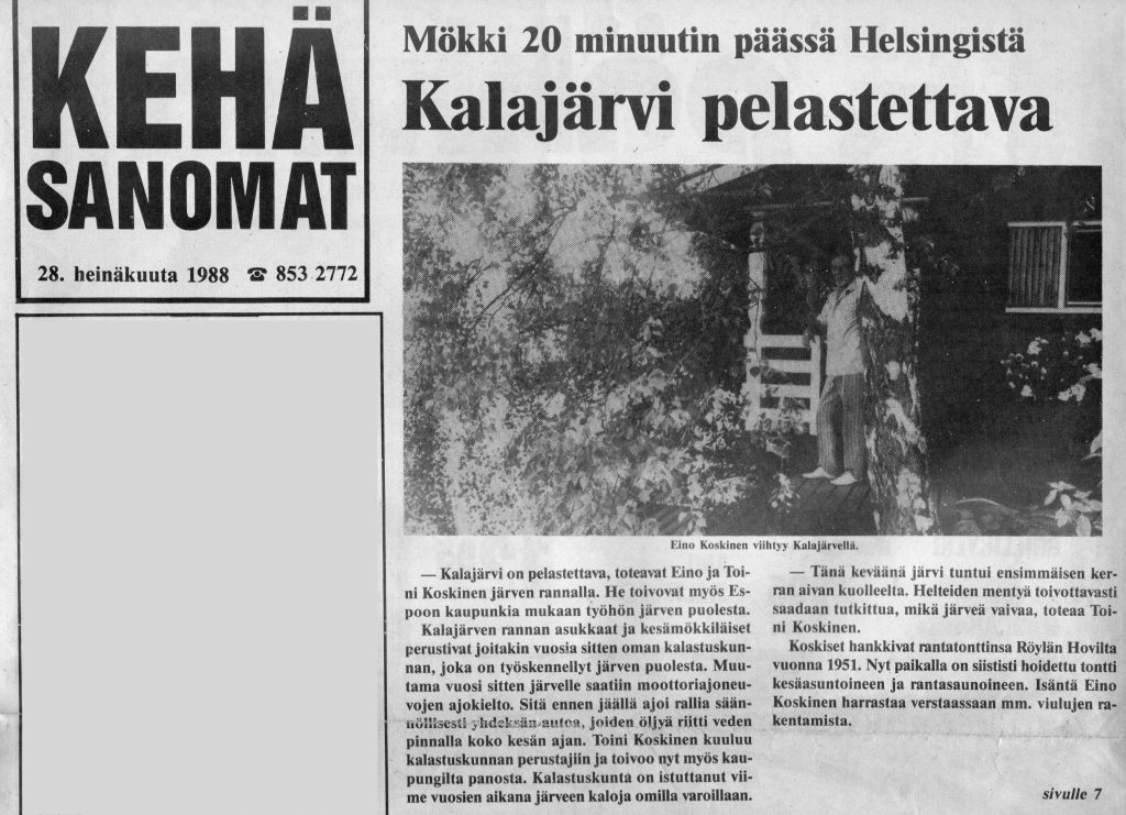 Vuonna 1988 Kehäsanomat teki juttumatkan Kalajärvelle ja haastatteli Eino ja Toini Koskista, Kalajärventielle aikanaan ensimmäisinä asettautuneita mökkiläisiä. Vaikka artikkelista on nyt jo kohta 40 vuotta aikaa, aiheet kuullostavat hämmästyttävän tutuilta; järven tila herättää huolta, kunnalistekniikkaa kaivataan, mutta järven rauhaa ja luontoa arvostetaan yli kaiken.