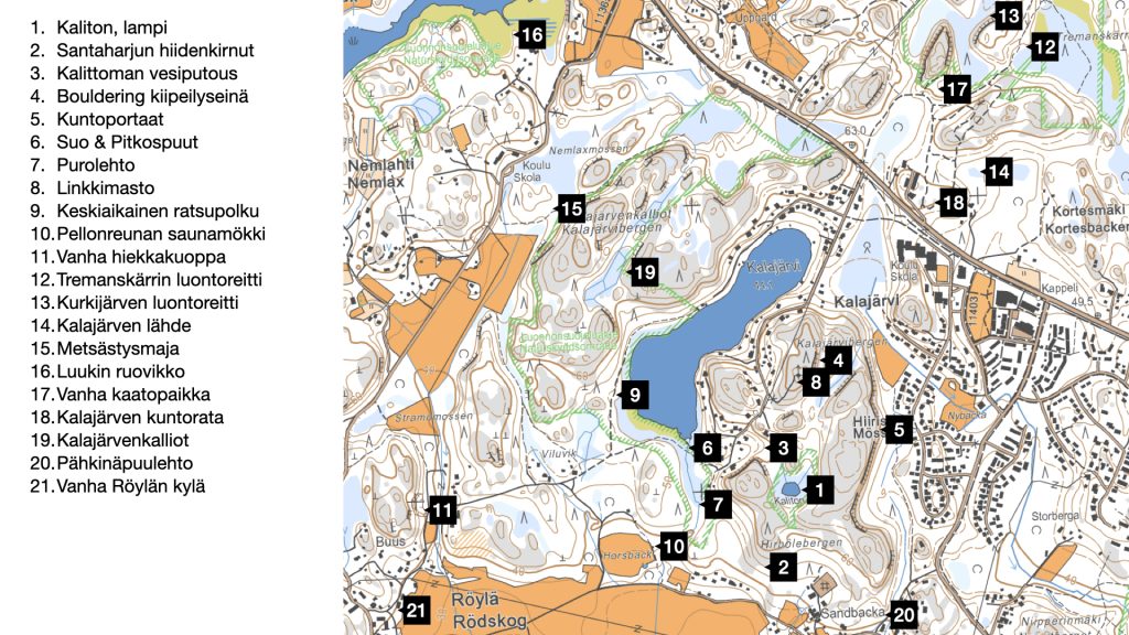 Kalajärven ympärillä olevissa metsissä ja kalliolla risteilee polkuja joka suuntaan. Reitit kulkevat aluetta täplittävien luonnonsuojelualueiden läpi upeissa maisemissa. Oheiseen karttaan on listattu mielenkiintoisia kohteita, jotka kannattaa käydä bongaamassa!